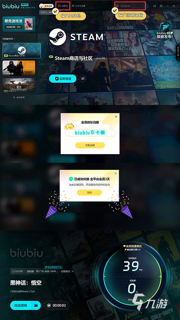 想必大家想要更深入的體驗劇情,那么游戲環(huán)境的優(yōu)化也是很重要的,不然是非常影響體驗感的,所以比較推薦biubiu加速器給大家,現(xiàn)在有新人24小時的免費體驗時長,而不論新老用戶,都可以通過“biubiu不卡頓”的兌換碼去得到72小時的加速時間,免費體驗時長加起來是比較長的。
