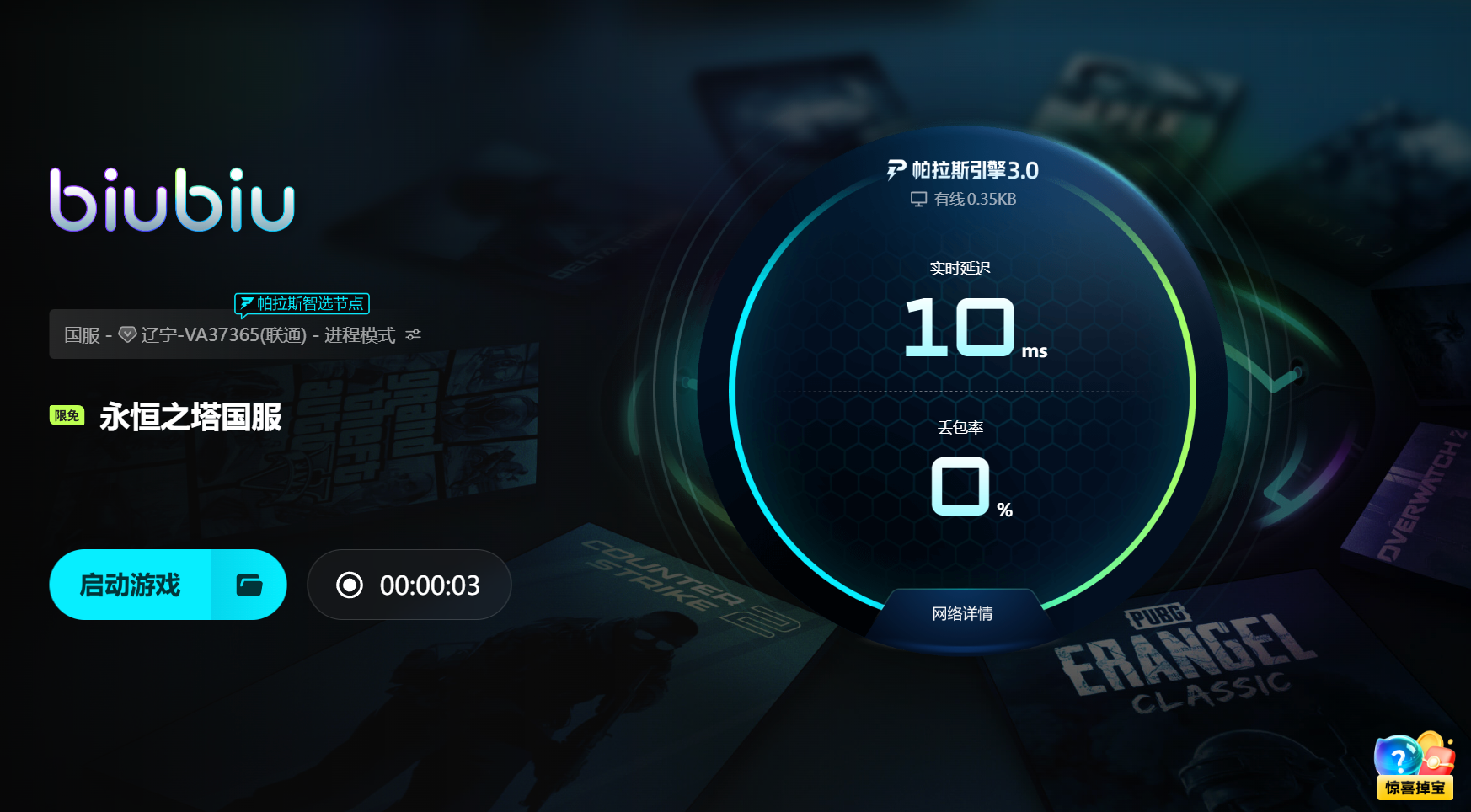 從玩家的操作感受來看,biubiu加速器依舊延續(xù)了清爽直觀的設(shè)計風(fēng)格。玩家啟動客戶端,在搜索框里輸入永恒之塔,就能一鍵開啟加速。選擇對應(yīng)的加速模式并點擊開啟,系統(tǒng)就會自動完成優(yōu)化,無需繁瑣設(shè)置。后臺占用極低,不會影響電腦性能,無論你玩哪類網(wǎng)游,都能一鍵開啟加速,實現(xiàn)一款軟件多場景通用。