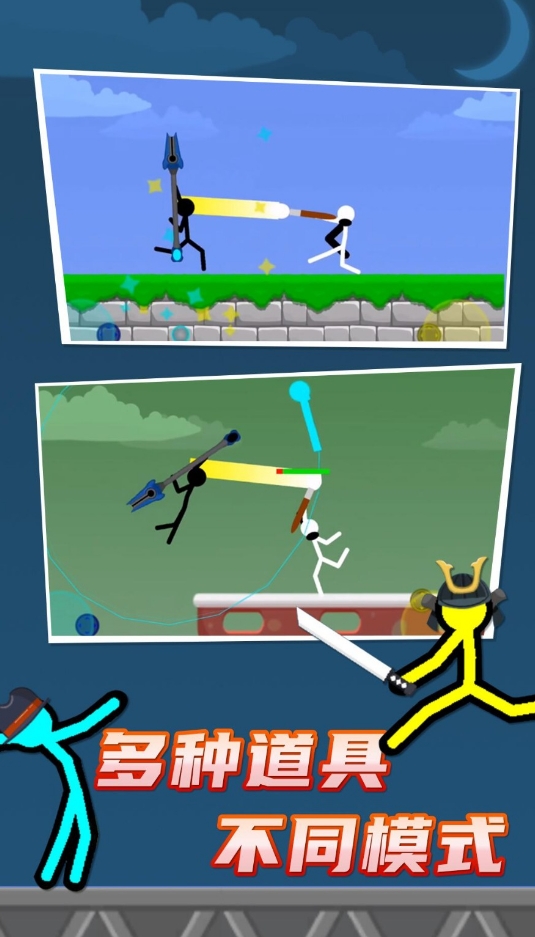 各位能在此作中進行激爽對戰(zhàn),是它為人們奉上的絕妙體驗。對戰(zhàn)的兩人都會在它這里化身為火柴人,使用多種奇怪的道具來進行競技,并且此作沒有任何的規(guī)則,只要能將對手給打倒或令他們從平臺下掉落,那么什么方法都能使用,也令它體驗起來會讓感到特別的自由與放松。最重要的是,此作的操控手感特別的舒服,即便人們隨便亂按也能十分輕松地讓角色打出不同的連招,拉滿了動作體驗。