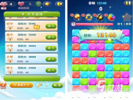 在豐富多彩的消除星星世界當(dāng)中,感受休閑又好玩的這種特色,看上去比較簡(jiǎn)單,點(diǎn)擊相同的方塊以后,完成消除,也沒(méi)有任何的時(shí)間限制,不過(guò)你想要在每個(gè)關(guān)卡當(dāng)中,達(dá)到目標(biāo)要求的分?jǐn)?shù),還是需要開(kāi)動(dòng)腦筋的。如果想要挑戰(zhàn)難度更高的,在關(guān)卡選擇的時(shí)候,以目標(biāo)分?jǐn)?shù)比較高的,點(diǎn)擊進(jìn)入其中以后,就可完成相應(yīng)的挑戰(zhàn)。