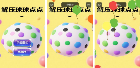 在球球的世界中,分為兩種不同的模式,比如正常以及快速模式,其實(shí)不論哪種模式,都比較考驗(yàn)的是玩家的反應(yīng)能力,因?yàn)樵陂_(kāi)局后,將會(huì)呈現(xiàn)出不同顏色的氫氣球,會(huì)從下向上,玩家卻需要快速點(diǎn)擊氣球,從而獲得更高的分?jǐn)?shù),都有規(guī)定的時(shí)間限制。