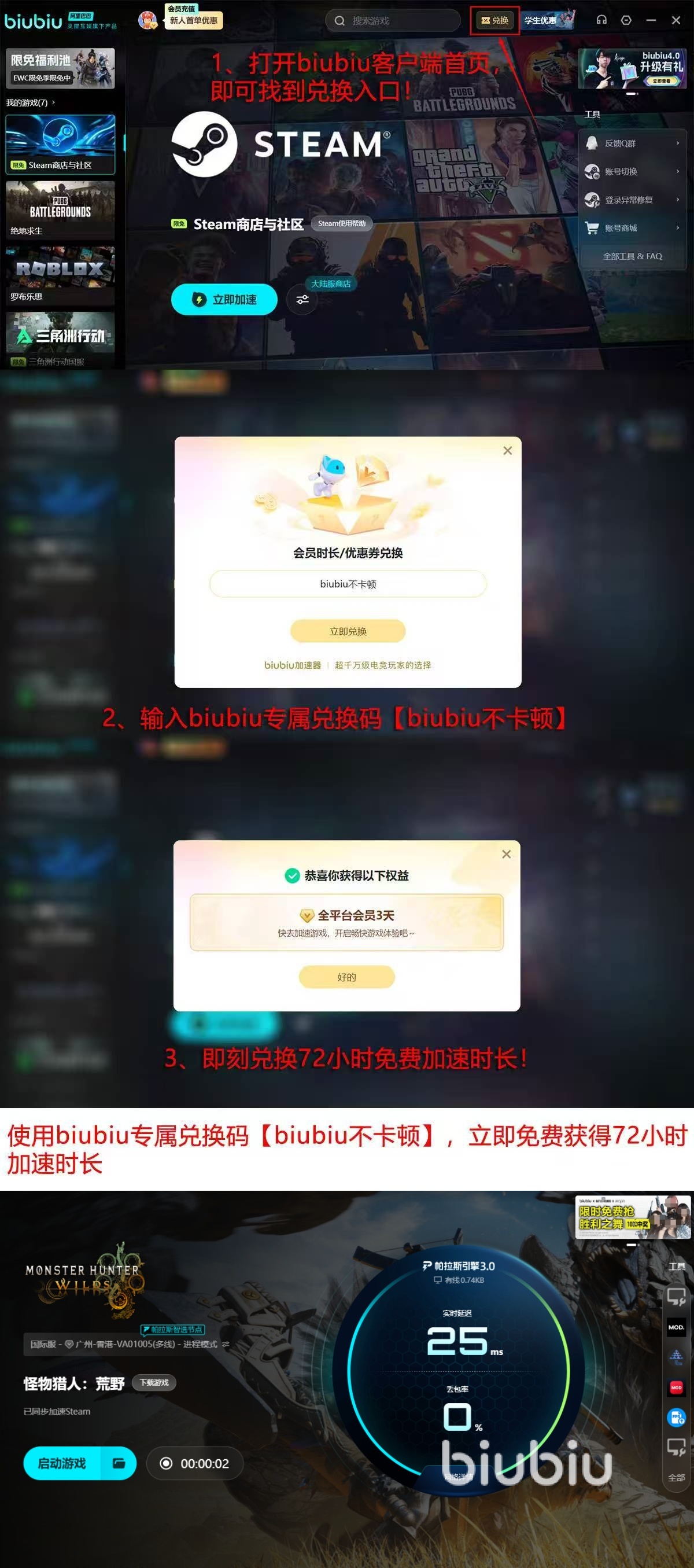 而對(duì)于一些希望能解鎖更多福利的朋友,尤其是不希望上來就充值氪金的玩家,那么biubiu針對(duì)新用戶帶來的24小時(shí)限免加速福利就不容錯(cuò)過,此外,也可主動(dòng)來點(diǎn)擊首頁上方兌換,在利用【biubiu不卡頓】,如此所有平臺(tái)用戶均可順利拿到72小時(shí)加速機(jī)會(huì)哦,讓玩家長時(shí)間游戲也不用擔(dān)心會(huì)有問題。