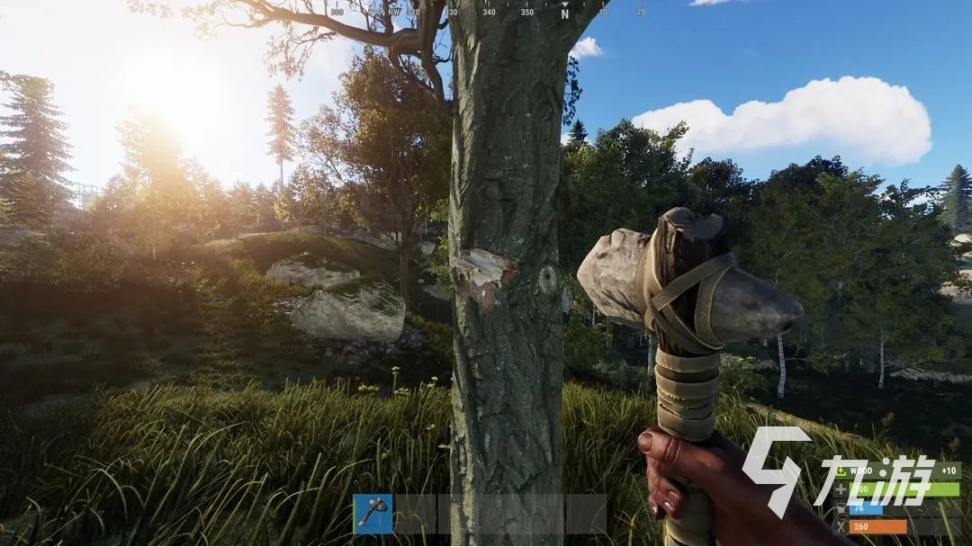 資源收集。開局之后,玩家在一片荒蕪的區(qū)域上,大家需要收集火把、石頭、礦產(chǎn)等資源,再使用石頭砍伐樹木,獲得木頭。玩家循序漸進(jìn),使用纖維麻布制作布匹,接下來,獵殺動物拿到動物皮毛和肉塊。