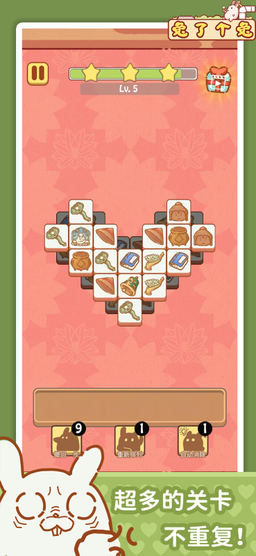 《兔了個兔》滿屏出現(xiàn)的都是那些活力四射的小兔子,游戲在運用了正統(tǒng)的消除玩法上,深度的挖掘了羊了個羊的玩法核心,在塑造的眾多精巧絕倫的關(guān)卡系統(tǒng)的同時,項目組還將一些精巧構(gòu)思的難題嵌入了其中,在畫風上則運用了更為具象化的可愛紛呈,而且更是依據(jù)關(guān)卡主題的特性,提供了綺麗繽紛的消除圖標類型。