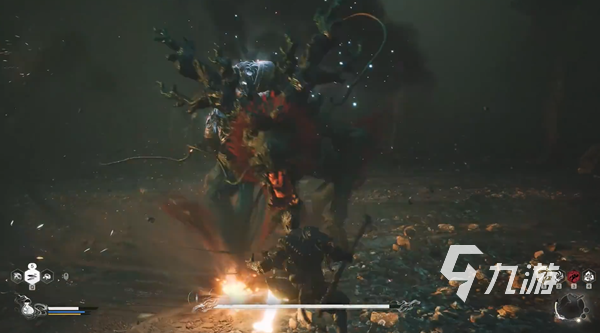 來到場景中的一顆大樹旁就會自動進(jìn)入過場動畫,此時首領(lǐng)赤髯BOSS就會登場,赤髯龍擁有強(qiáng)壯的四肢,背部還帶有可以發(fā)射電球的器官,雖然身形龐大但是行動比較敏捷,給我們帶來了很大的壓力。初見時赤髯龍固定會出一招跳躍砸地近身,這里大家注意在落地的一瞬間就要往后翻滾躲避。在近身后boss可能會使用尾巴進(jìn)行橫甩并且?guī)в须娏鞴?,在翻滾閃避的同時抓住間隙進(jìn)行攻擊。