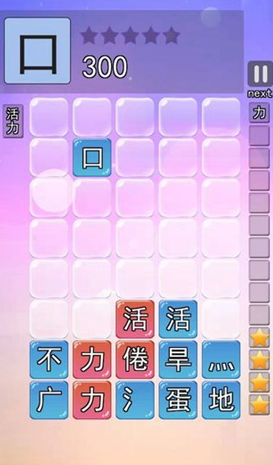 游戲以簡約的界面為基底,融入圓潤可愛的視覺元素,讓整個(gè)游戲場景充滿溫馨舒適的氛圍。玩家在游戲中需巧妙組合持續(xù)降落的漢字模塊,挑戰(zhàn)難度將逐漸提高,悄然考驗(yàn)著對漢字結(jié)構(gòu)與書寫順序的精準(zhǔn)把控。通過將漢字拆解與重組巧妙融入游戲進(jìn)程,讓玩家在沉浸式體驗(yàn)中提升漢字認(rèn)知能力,實(shí)現(xiàn)知識(shí)獲取與娛樂體驗(yàn)的完美平衡。每個(gè)漢字模塊都承載著獨(dú)特的文化密碼,玩家在解鎖新字的同時(shí),還能通過內(nèi)置的文化圖鑒系統(tǒng),深入了解漢字演變歷程與背后的歷史典故。