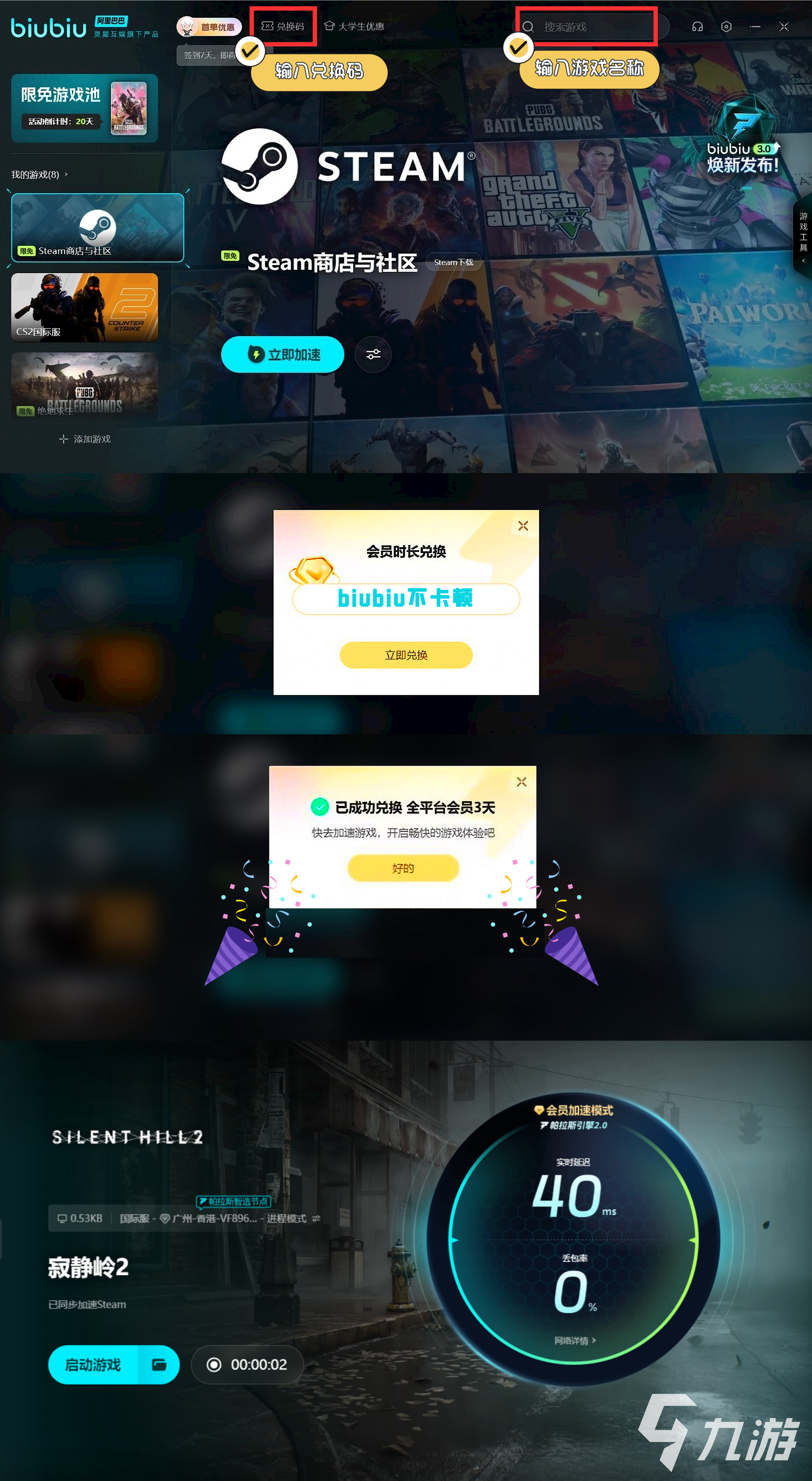 現(xiàn)在biubiu給新用戶免費試用24小時的,另外兌換碼【biubiu不卡頓】新老用戶都能拿去換取額外的72小時加速時長,新人可以用96小時了。