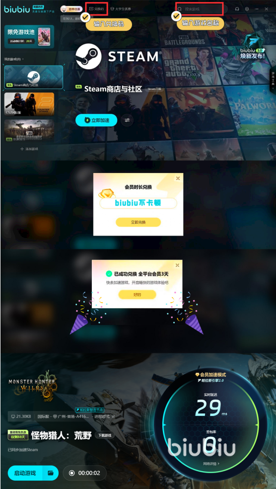 這種怪物一般都是聯(lián)網(wǎng)組隊(duì)?wèi)?zhàn)斗,面對(duì)這種強(qiáng)大的怪物,如果網(wǎng)絡(luò)不穩(wěn)定是很影響戰(zhàn)斗節(jié)奏的,提前將biubiu加速器開起來,可進(jìn)行網(wǎng)絡(luò)加速,保持網(wǎng)絡(luò)環(huán)境通暢,現(xiàn)在有3小時(shí)新人加速機(jī)會(huì),外加“biubiu不卡頓”兌換3天的活動(dòng)。針對(duì)該游戲也有對(duì)應(yīng)活動(dòng),從現(xiàn)在一直到3月14日都免費(fèi)加速,還可參加抽獎(jiǎng)活動(dòng),有機(jī)會(huì)獲取游戲本體,周邊,會(huì)員時(shí)間等獎(jiǎng)勵(lì)。