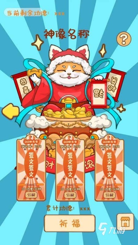 可愛的招財貓的形象就在畫面上呈現(xiàn),《拜托了神明》這款手游的操作倒是沒什么難的,玩家們只需要點擊屏幕就可以等待結(jié)果了,你們可以在這里挑選不同的祈福夙愿,而且游戲內(nèi)不會限制到玩家們的祈福次數(shù),整個游戲所表現(xiàn)出來的溫馨和治愈的感覺,相信可以很好的帶給你們哦。