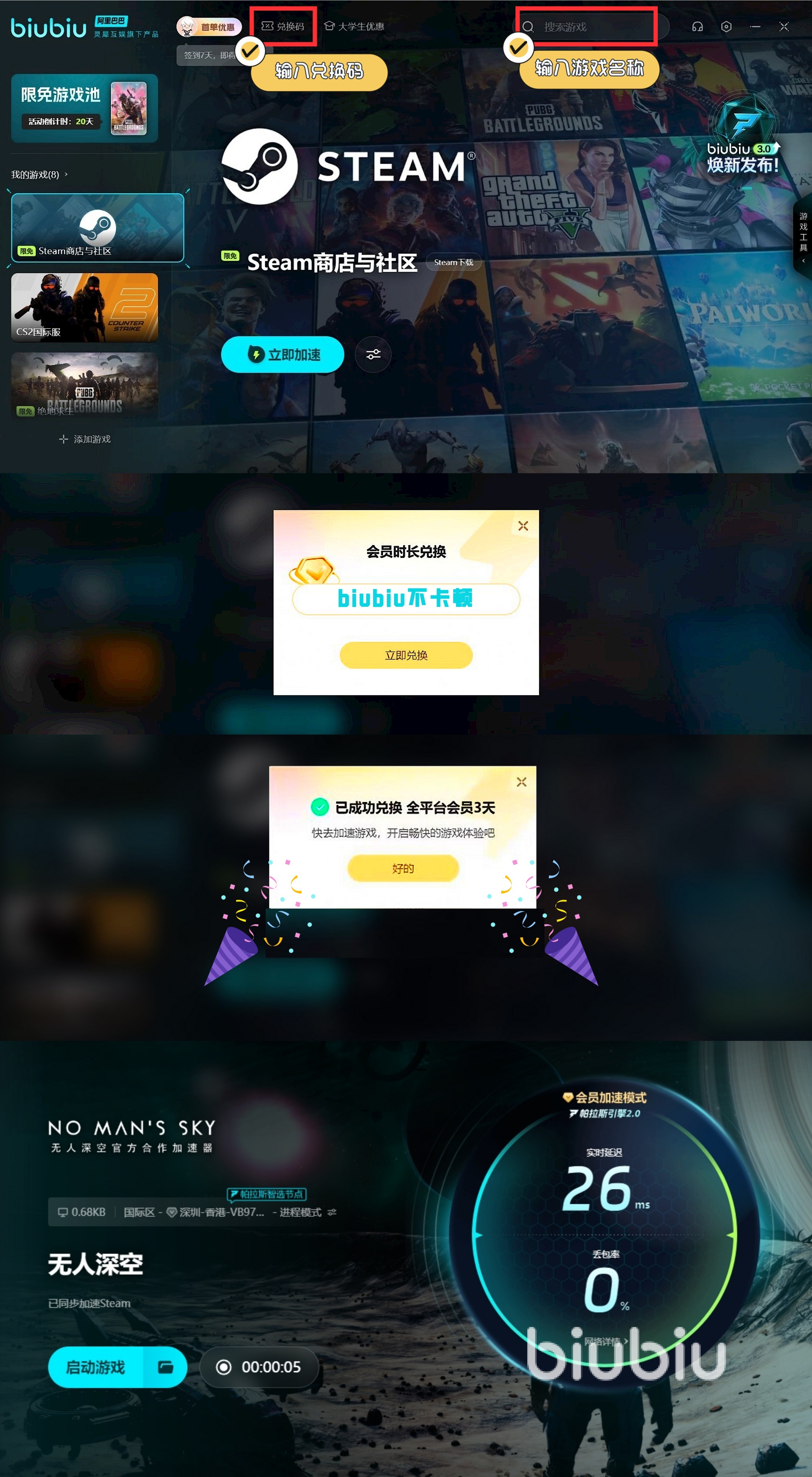 若是玩家想要去獲得更多加速時長,其實到時候還可主動去點擊界面中的兌換按鈕,然后借助【biubiu不卡頓】,如此一來所有平臺用戶都能順利領(lǐng)取到72h的加速時長,讓自己去長時間體驗。