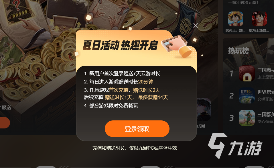 九游云游戲免費(fèi)嗎?需不需要開會員?這是大家常有的對游戲平臺的關(guān)心,在九游云游戲上,大家可以免費(fèi)領(lǐng)取游戲時(shí)長,比如現(xiàn)在沒有登錄過這個(gè)平臺的小伙伴們可以點(diǎn)擊鏈接,進(jìn)入平臺注冊登錄之后會領(lǐng)取7天的免費(fèi)使用時(shí)長;每天大家進(jìn)入平臺還會額外獲得20分鐘,20分鐘足夠讓大家玩一局300大作戰(zhàn)了;最后,大家可以充值自己感興趣的游戲,也可以隨便挑一款游戲進(jìn)行充值,因?yàn)檫@樣大家還可以再獲得2天的免費(fèi)使用時(shí)長,后續(xù)的充值還會贈送時(shí)長1天,并且有一部分游戲還免費(fèi)暢玩。