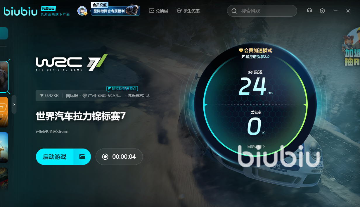 不過值得一談的是wrc7作為國際大作,如今暫時沒有上線國服。所以大家需要使用biubiu,才能優(yōu)化本地網(wǎng)絡(luò),并獲得成為拉力錦標賽一員的資格。新用戶的話可獲得3小時的免費加速,然后新老用戶通過【biubiu不卡頓】,就能額外獲得三天免費加速。若是在比賽途中太卡的話,那么就很有可能被周圍的沙塵暴給淹沒。用上了加速器后,就可以無懼這種惡劣環(huán)境,依然奮然前行。