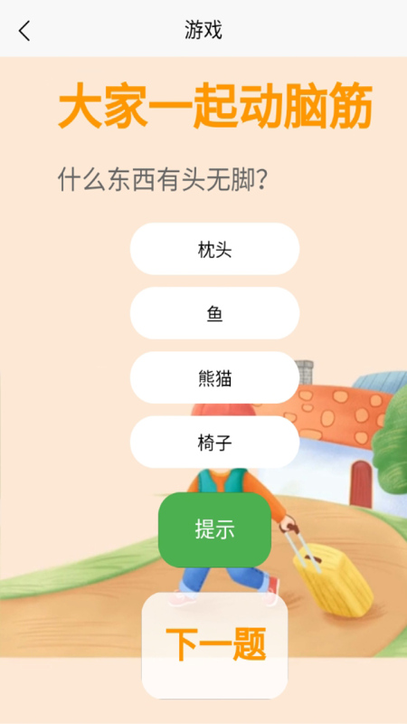 憑借著快速的思考來為我們進(jìn)行智力測驗的挑戰(zhàn),《大家一起動腦筋》這款手游中我們能夠面對系統(tǒng)提出的問題,正確的選擇相應(yīng)的回答來完成你們的內(nèi)容,游戲中我們將會感受到極為休閑輕松的過程,但是后續(xù)的難度也會有所提升,關(guān)鍵就在于我們要多去開動腦筋,才能得到正確的回答哦。