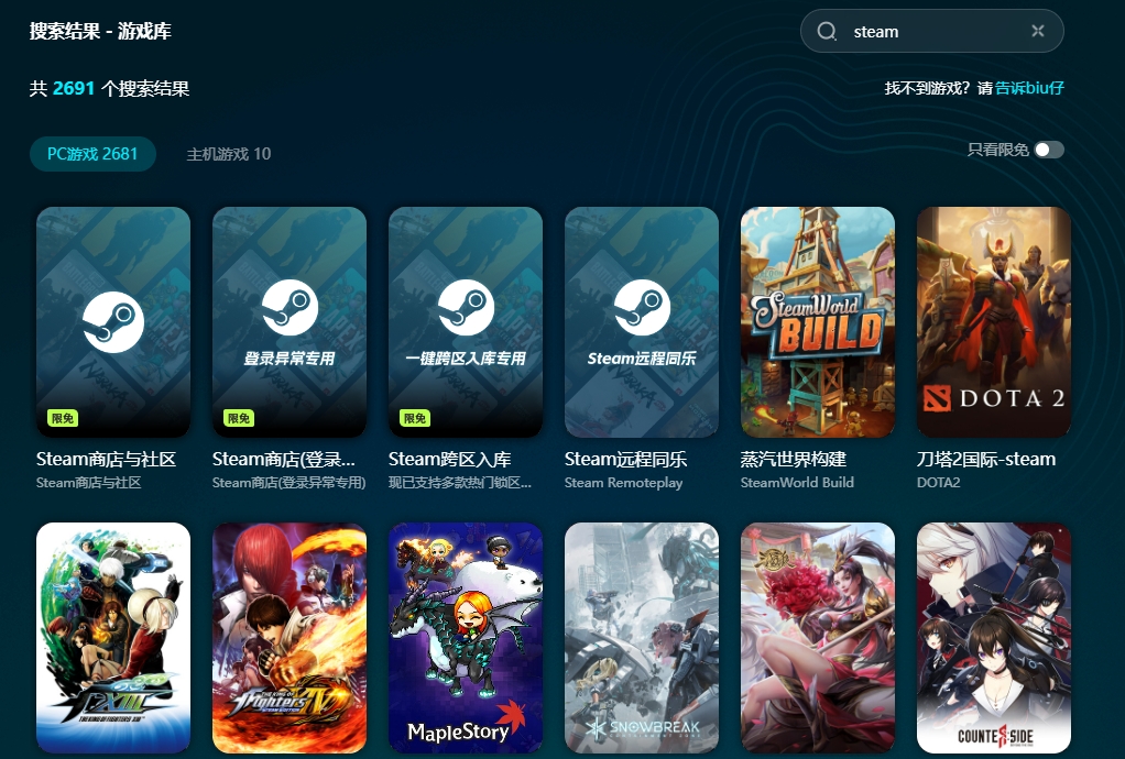 當(dāng)然平臺(tái)的操作也是很簡單的,小伙伴們點(diǎn)擊下載之后,只需要搜索相應(yīng)的游戲名稱,選擇適合的專區(qū)登陸體驗(yàn)即可,而且若是還沒下載,在steam里去下這款作品的話,也可以給steam商店加速,照樣可以享受到極致的服務(wù),還會(huì)縮短大家下載游戲的時(shí)間,能盡快的玩兒到。