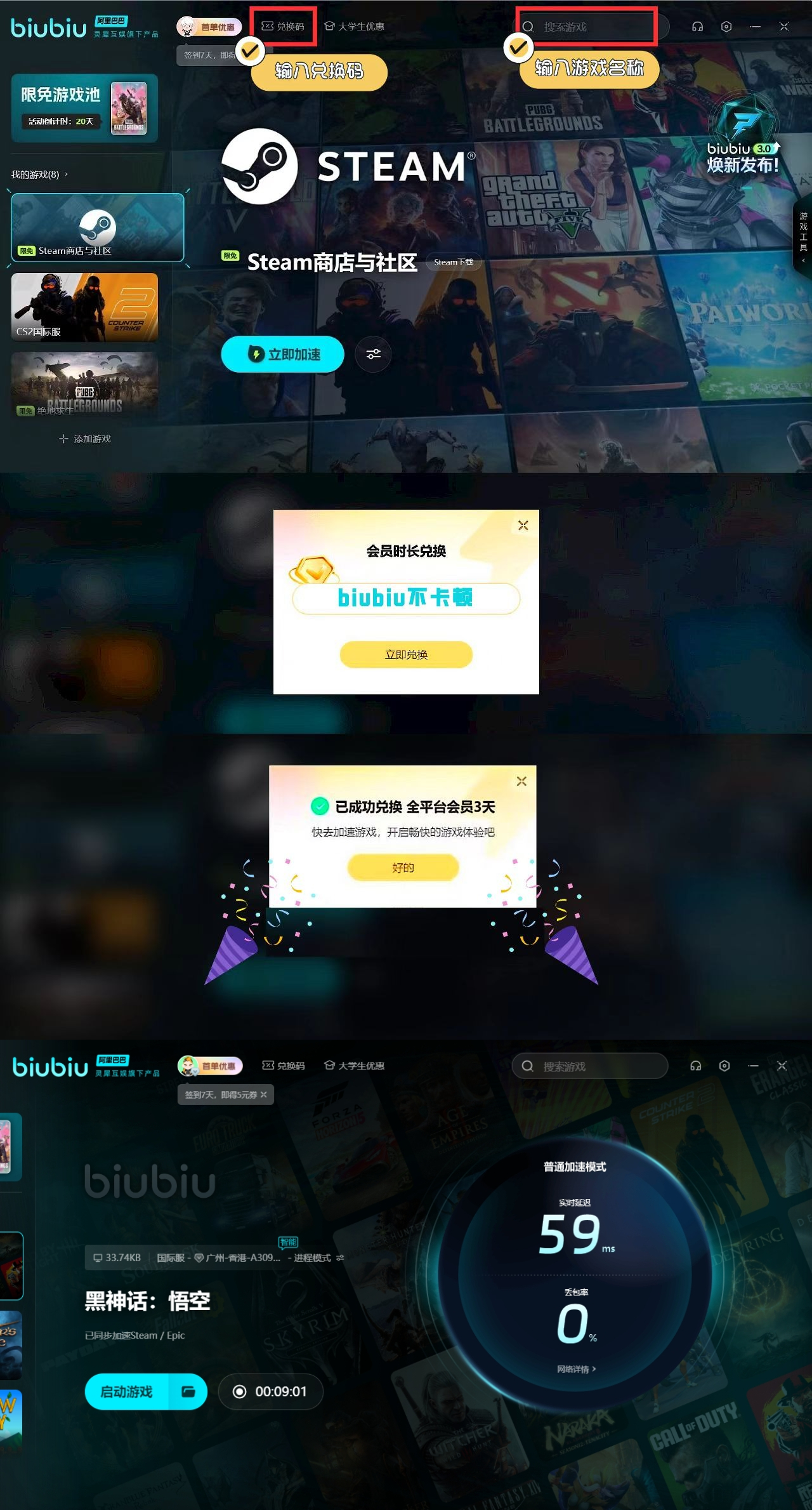 黑神話悟空是目前Steam熱度較高的一款游戲,在體驗(yàn)的過(guò)程中,不少玩家也會(huì)遇到延遲卡頓的問(wèn)題,這對(duì)于我們的戰(zhàn)斗是有著很大的影響。想要有效的解決,不妨下載一個(gè)biubiu加速器。如果是新用戶(hù),在注冊(cè)一個(gè)全新賬號(hào)之后就可以直接獲取到官方贈(zèng)送的24小時(shí)加速福利,這個(gè)一定要好好利用,能夠讓新玩家們更好的了解biubiu的加速效果。此外,所有用戶(hù)還可在兌換界面輸入【biubiu不卡頓】來(lái)獲取3天額外的加速時(shí)間,這個(gè)都是目前官方給予玩家們的福利哦。