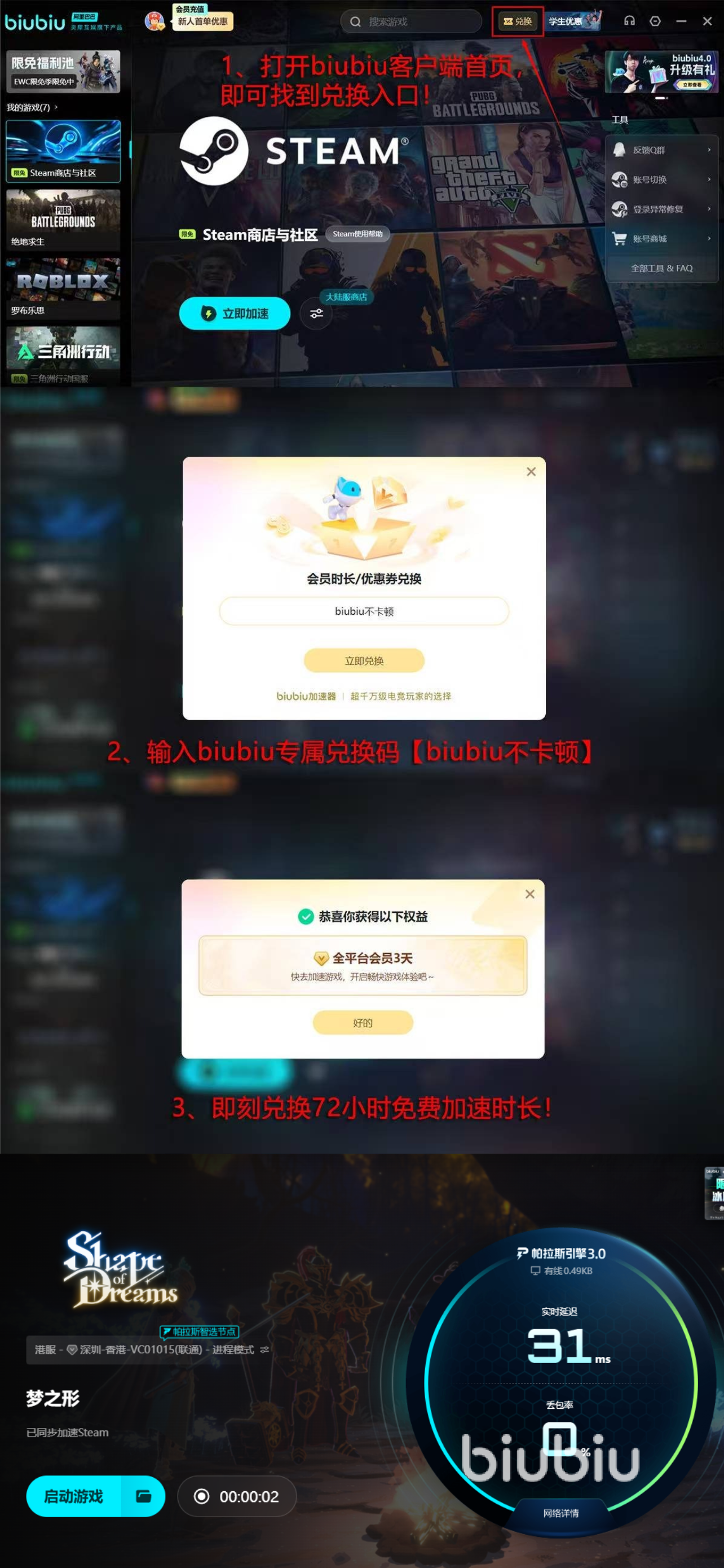 考慮到很多用戶是首次接觸該平臺,biubiu特別推出了新用戶福利,新人注冊成功后即可自動獲得24h免費時長進行提速,無需玩家手動操作,一鍵就能立即體驗流暢加速。此外,每位用戶還可在指定區(qū)輸入口令【biubiu不卡頓】,額外領(lǐng)取3天免費時長,輕松享受更持久的優(yōu)質(zhì)網(wǎng)絡(luò)服務(wù)。