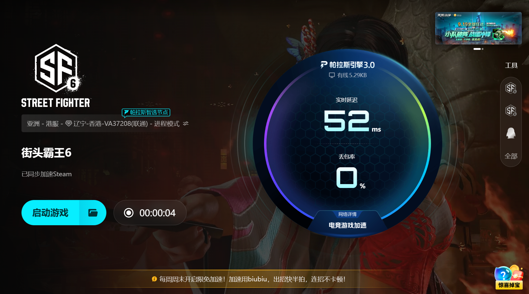 玩家的實際體驗反饋也很直觀。很多人表示,開啟biubiu后,街霸6的匹配速度更快,延遲更低,幀同步穩(wěn)定,連招成功率明顯提高??鐓^(qū)匹配港服、日服、美服也能保持低延遲,再也不用擔(dān)心因為網(wǎng)絡(luò)回滾被莫名其妙擊倒,排位勝率提高了一個檔次。