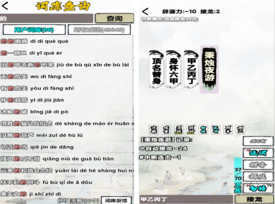 以大家比較熟悉的成語接龍玩法為主,只不過又加入了獨(dú)特的肉鴿策略元素,給大家?guī)砣碌囊嬷求w驗(yàn)。玩家在這里面,既可通過既能選擇成長,也能在豐富的關(guān)卡當(dāng)中,享受不一樣的挑戰(zhàn),在首尾接龍的過程當(dāng)中有著多變的規(guī)則,無論是通過任何的一種規(guī)則,都可以享受所具備的無限可能。在畫面上,以簡約的水墨丹青畫風(fēng)為主。