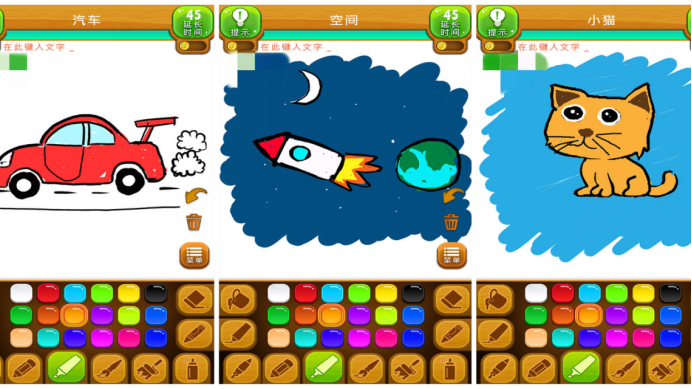 游戲內(nèi)容十分簡(jiǎn)單,玩家只需要合理繪制圖案或者猜出圖案即可,新手玩家也能迅速融入游戲,享受游戲樂(lè)趣。延長(zhǎng)時(shí)間和提示功能也讓猜答案變得更加簡(jiǎn)單。同時(shí)游戲的畫(huà)面風(fēng)格清新簡(jiǎn)潔,還提供了多種顏色和筆刷油漆桶等工具讓玩家盡情創(chuàng)作,畫(huà)出自己的風(fēng)格。小伙伴們快來(lái)畫(huà)出各種腦洞大開(kāi)的圖片吧!