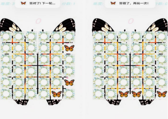這是與漂亮的蝴蝶有關(guān),考驗(yàn)玩家記憶能力的,在以大型的蝴蝶為背景的游戲當(dāng)中,會(huì)出現(xiàn)很多的位置,只有準(zhǔn)確記錄蝴蝶出現(xiàn)的位置,將其找到的情況下,就能順利地將其抓到完成任務(wù)。由于每一輪蝴蝶出現(xiàn)的位置都會(huì)不一樣,所以玩家所面臨的難度也是會(huì)完全不同,如果答錯(cuò)的情況下,可以通過(guò)再玩一次的方式繼續(xù)體驗(yàn)。