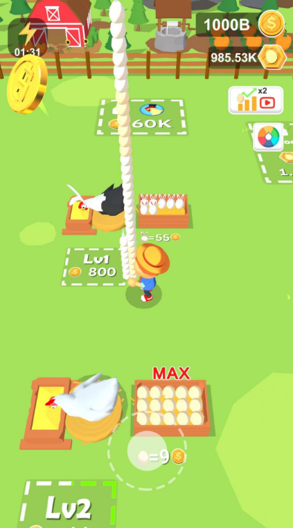 游戲的畫(huà)面干凈清爽,玩法也很簡(jiǎn)單,大家進(jìn)入這個(gè)游戲后會(huì)擁有一個(gè)專(zhuān)屬的雞蛋工廠,每天任務(wù)也不復(fù)雜,先養(yǎng)小雞,它們可以孵出很多雞蛋等,雞蛋的數(shù)量變夠了就可以把它們包裝起來(lái)賣(mài)出去,就可以馬上賺到錢(qián)了,賺的錢(qián)不可以亂花,用處有很多,用這些錢(qián)可以買(mǎi)到新設(shè)備給工廠來(lái)一個(gè)大升級(jí),工廠升級(jí)后雞蛋生產(chǎn)的速度也在不斷的往上漲,不要猶豫,快來(lái)游戲里經(jīng)營(yíng),工廠去體驗(yàn)養(yǎng)雞到賺錢(qián)再到擴(kuò)大生產(chǎn)的快樂(lè)過(guò)程。