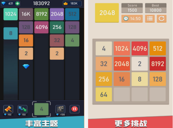 屬于非常燒腦,能在多彩的游戲世界當(dāng)中,看到超多數(shù)字的,利用不斷移動(dòng)甚至是下落等方法,將數(shù)字不斷的達(dá)到1024,甚至是兩倍這樣的數(shù)字,就是2048以及更高的數(shù)字為主。通過(guò)發(fā)揮到無(wú)限大的這種方式,考驗(yàn)玩家的智力水平。它也是擁有著一定挑戰(zhàn)性的,因?yàn)樗粌H有2048玩法,還有其他的數(shù)字玩法,一共有12種。