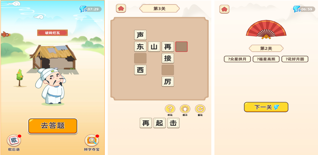 對(duì)詩(shī)詞歌賦比較感興趣的青少年朋友不妨嘗試這款益智神作,這款作品具備不俗的互動(dòng)性和教育意義,玩家有機(jī)會(huì)接觸各種詩(shī)詞歌賦并完成任務(wù),填空互動(dòng)的游戲設(shè)定讓玩家記住了許多知識(shí),比如詩(shī)詞的含義和詩(shī)人的名字,游戲采用問答解謎類的闖關(guān)性質(zhì),這樣的設(shè)定對(duì)玩家的記憶力和詩(shī)詞知識(shí)儲(chǔ)備有好處。