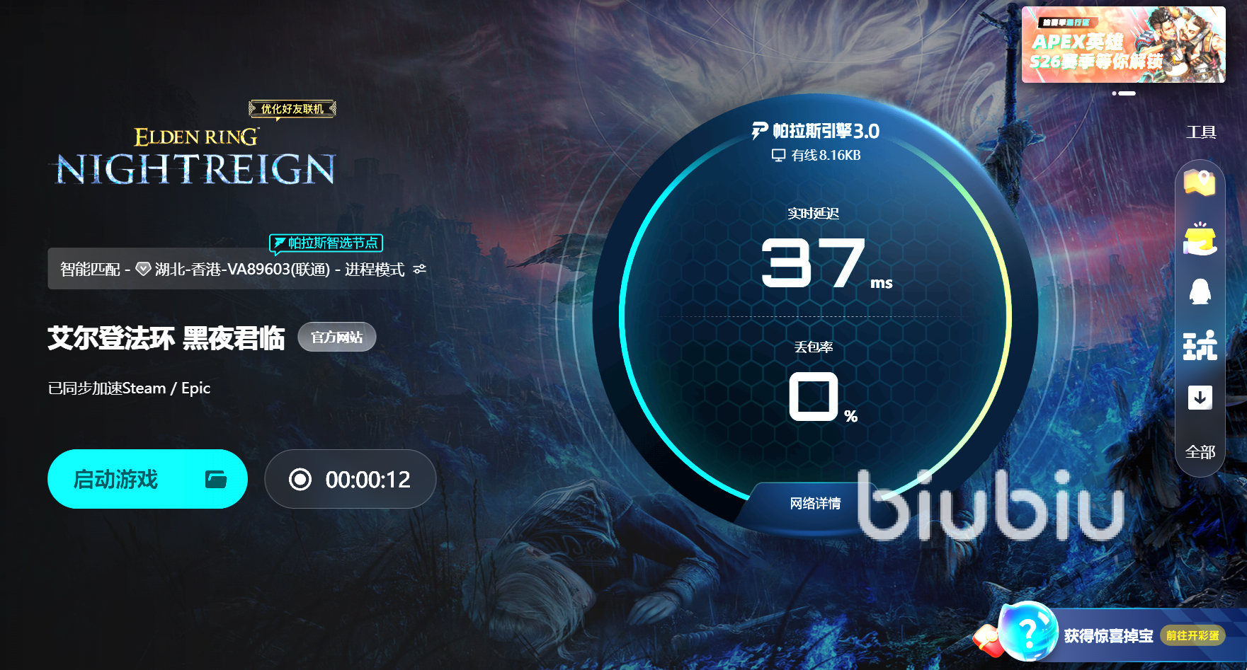 在使用上,biubiu加速器保持了簡(jiǎn)潔的操作體驗(yàn)。玩家只需打開客戶端,在搜索欄輸入“艾爾登法環(huán)”,選擇加速專區(qū)并點(diǎn)擊開啟,系統(tǒng)會(huì)自動(dòng)完成優(yōu)化,無需復(fù)雜設(shè)置。軟件后臺(tái)占用極小,不會(huì)影響電腦性能,并且同時(shí)支持Steam、Epic等多個(gè)游戲平臺(tái)。不僅能幫助解決《艾爾登法環(huán) 黑夜君臨》的異常退出,還能優(yōu)化FPS、MOBA、MMO等多類型游戲。