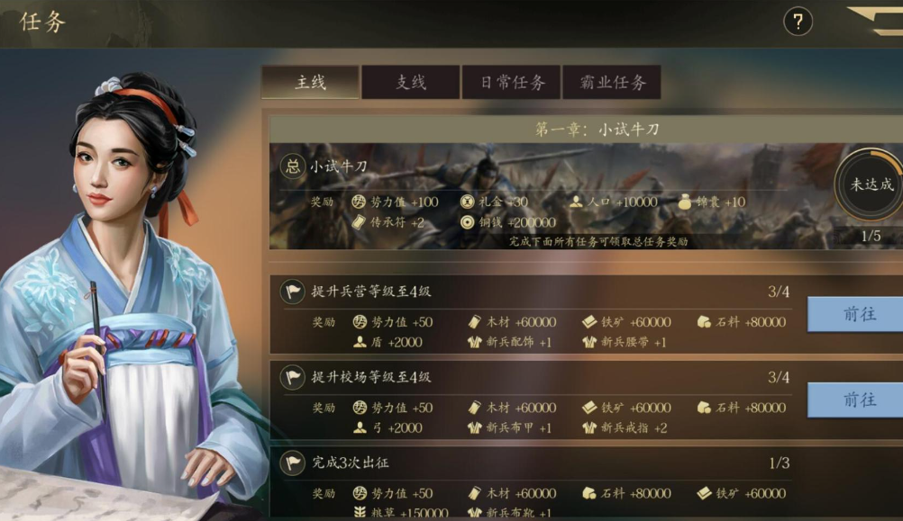 想要玩好這個(gè)游戲,最重要的只有三個(gè)字,就是“做任務(wù)”。無(wú)論是新手期還是老玩家,都要通過(guò)做任務(wù)獲取大量資源和貨幣,才能支撐后續(xù)的城池建設(shè)和軍隊(duì)竣備。雖然這也是一個(gè)城池養(yǎng)成策略游戲,但主要玩法不僅需要玩家發(fā)展自己的城池,還要去攻打別人的城池,侵略戰(zhàn)爭(zhēng)也是獲得大量資源的途徑之一,只有擁有足夠資源才能招募更多士兵,還可以通過(guò)抓捕武將培養(yǎng)成軍隊(duì)將領(lǐng),提高戰(zhàn)力。