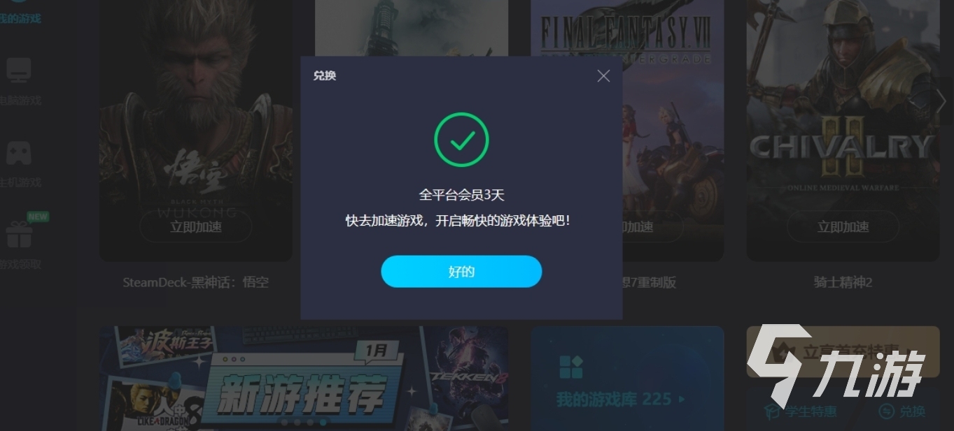 大家若是錯過了這個限免的加速體驗機會也不需要氣餒,因為平臺針對新用戶開放了24h的免費加速時長,到時候各類不同的游戲作品都能開啟加速,不論是PC還是主機都是可以的哦,此外更是有著三天的免費加速機會給到大家,具體的領(lǐng)取方式就是在首頁通過兌換窗輸入“biubiu不卡頓”就能額外的領(lǐng)取,這樣一來,大家就算不充值也能享受它帶來的加速效果了。