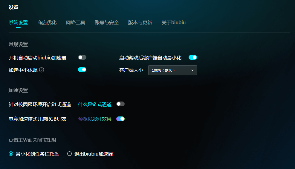 biubiu擁有智能節(jié)點功能,加速啟動方便又快捷,用戶無需手動選擇節(jié)點,系統(tǒng)會根據(jù)用戶所在的位置和網(wǎng)絡情況來匹配合適的線路,一連就有好網(wǎng)絡。同時軟件提供多種個性化設置,不僅可以調整客戶端大小,還能選擇打開RGB燈效,在電競加速模式當中感受絢麗的視覺效果,玩起來更帶感。